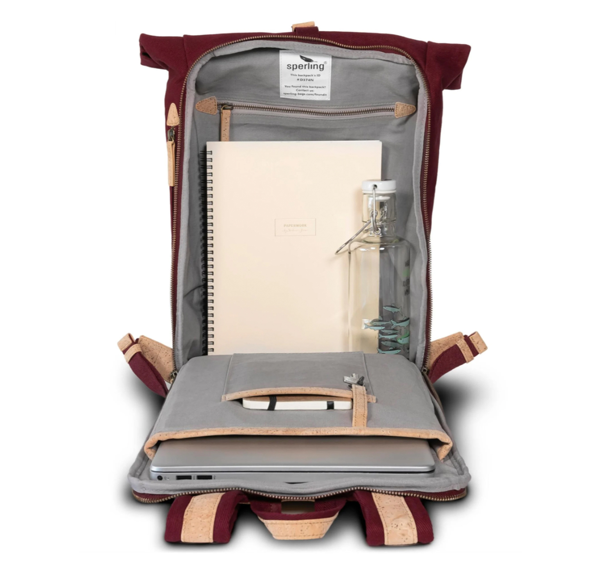 Il nuovo zaino Sperling per vespisti e scooteristi unisce funzionalità e sostenibilità grazie al suo design robusto e idrorepellente. Realizzato in twill di cotone organico e sughero naturale vegano, offre protezione e stile in qualsiasi condizione atmosferica e situazione. Lozaino   ha un'imbottitura di alta qualità sullo schienale, sugli spallacci e sul fondo per garantire il massimo comfort. Uno scomparto imbottito per laptop offre spazio sicuro per dispositivi fino a 15,6" o 26,5 cm di larghezza.