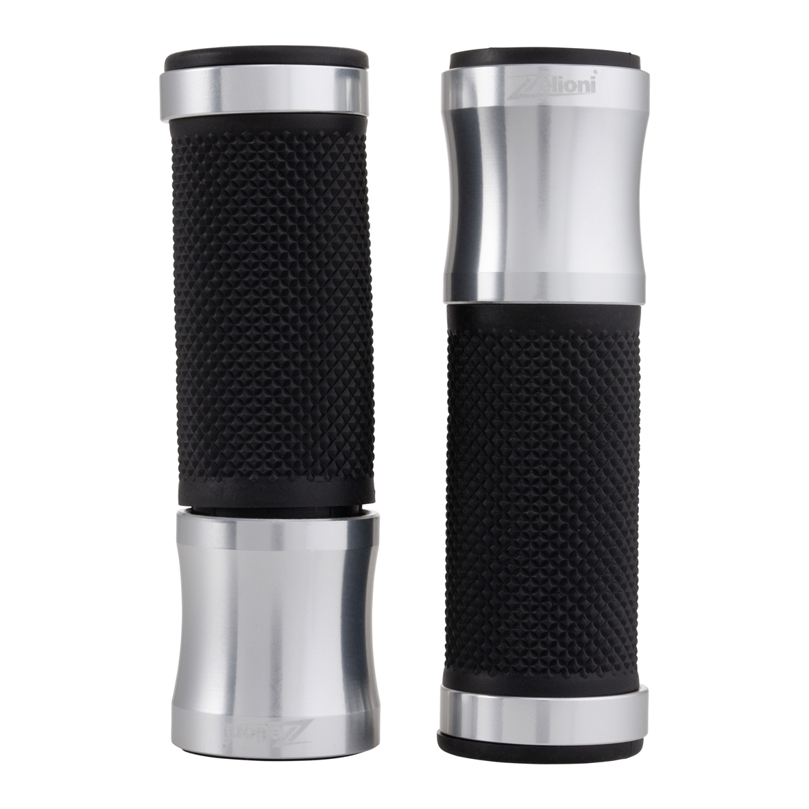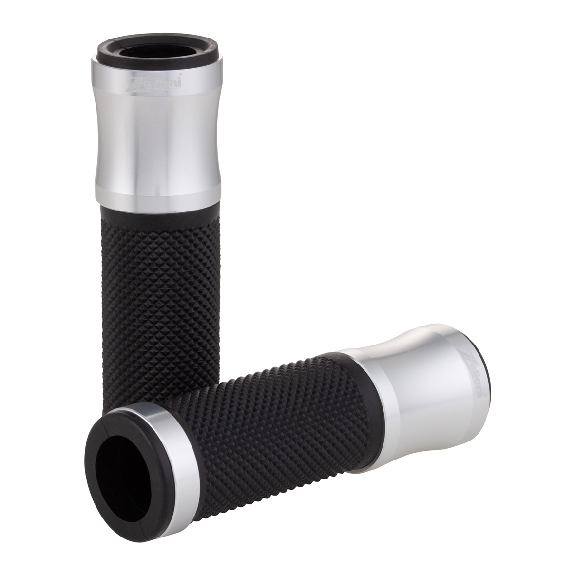Impugnatura ergonomica con palmo gommato. Tappi in alluminio con logo ZELIONI inciso a laser. Estremità aperte per il montaggio di pesi terminali/specchi.