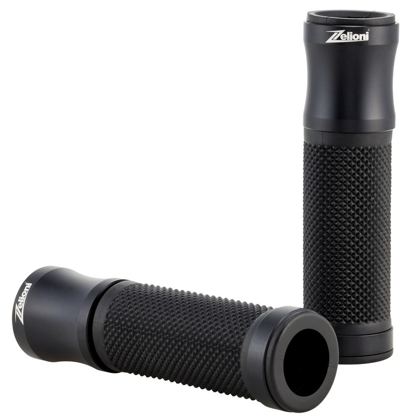 Impugnatura ergonomica con palmo gommato. Tappi in alluminio con logo ZELIONI inciso a laser. Estremità aperte per il montaggio di contrappesi/specchi terminali della barra.