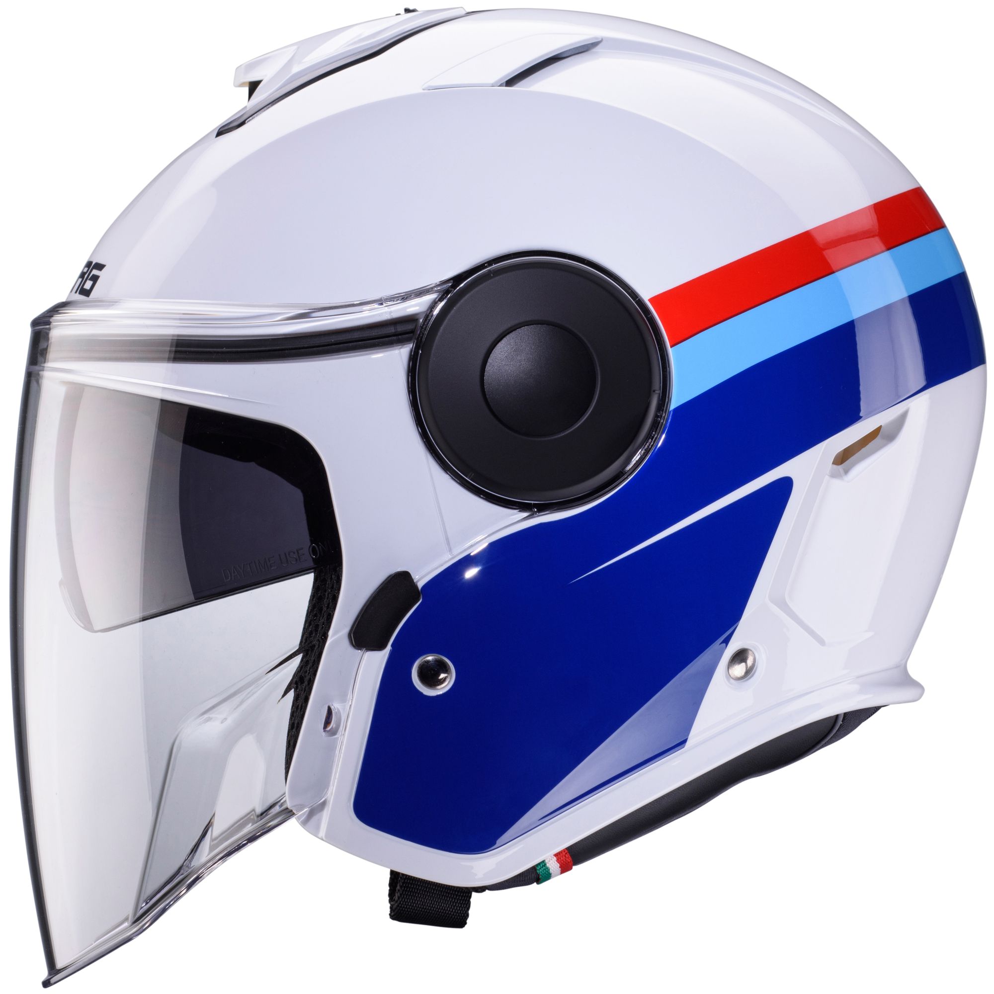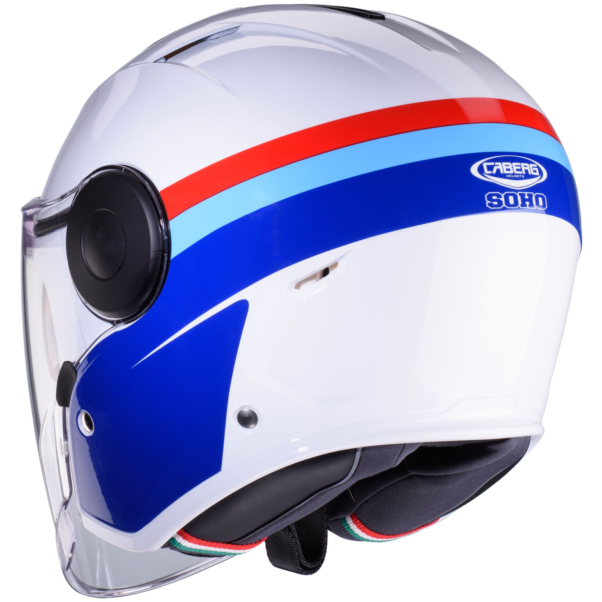 Il casco jet Caberg Soho con la decorazione Zephyr nei colori bianco/blu/rosso ha le seguenti caratteristiche: